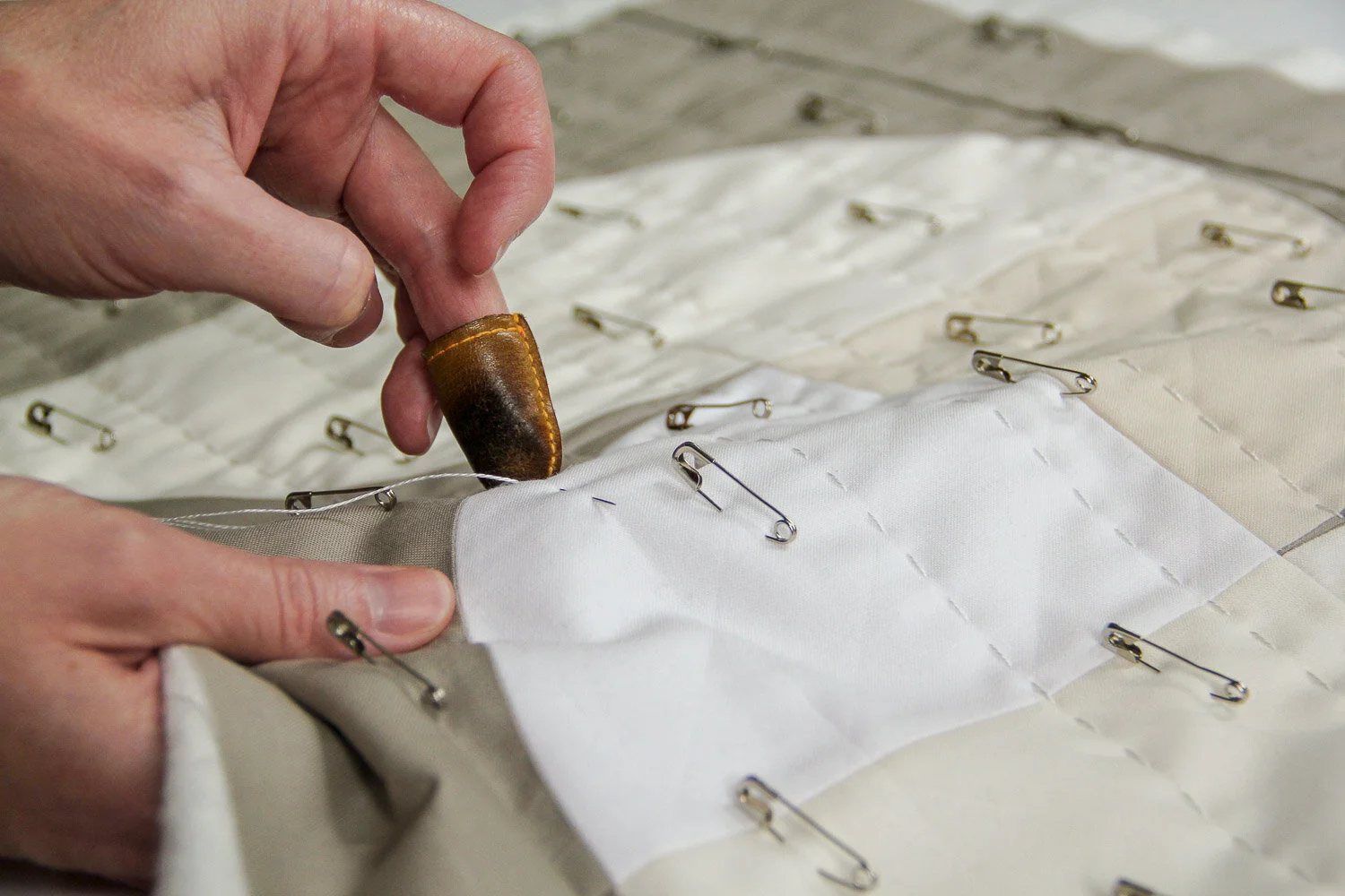 Once the pillow was pieced and basted, I marked a few different designs with my Hera marker before ultimately deciding on my usual: straight lines. I spaced these 1.5” apart and knew that I wanted to hand quilt this project to give it that little bit of extra. I pulled out some DMC perle cotton in bright white and got to work. It didn’t take long before this was all quilted up and ready to be trimmed up and finished.
